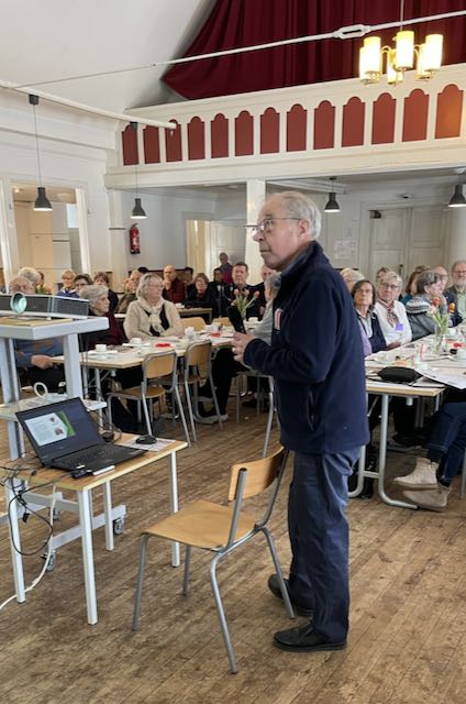En trevlig nyhet var att ett bildspel snurrade på under kaffepausen och innan mötet började: På den nya, stora skärmen kunde vi följa med händelserna från aprilträffen senaste år. Det är Stig Kavander som har skapat bildspelet av de många foton han tagit under träffarna. Till vår glädje kommer denna programpunkt att fortsätta även under följande möten. Den beledsagande musiken drunknade nog totalt i publikens sorl …..
