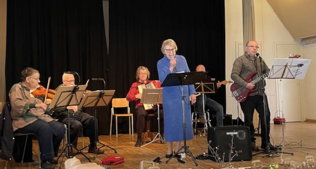 Allsången ledd av Jörgen Hollsten och med Kurre Långbacka vid pianot lockade fram ”Båklandets vackra Maja” och ”Två solröda segel”. Den senare i en annorlunda tappning då Kurre tog fram sitt munspel och visade att han behärskar även det instrumentet.