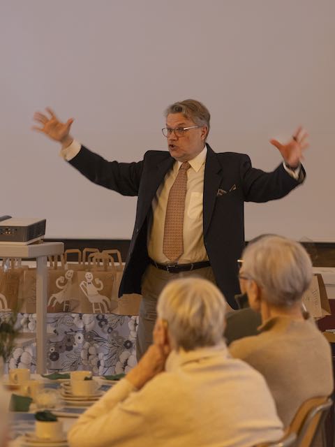 I väntan på följande programnummer satte sorlet igång. Apotekare Henrik Brenner skrattade gott åt det glada ”oljudet” vi förde då han kom fram för att berätta om sin tid på Pargas Apotek. Först tvivlade han på att han skulle få oss att tystna, men vi är ju inte bara pratglada utan också ”hörglada”, så vi lyssnade gärna till hans charmiga redogörelse om sin väg från Varkaus via Borgå och sommar-Korpo till jobb-Nagu, Karis, Nådendal och nu Pargas, som han ämnar stanna i tills han ansluter sig till oss pensionärer om ett antal år. Han berättade även om apotekets ”stamkundssystem” som ger rabatt på andra varor än mediciner.