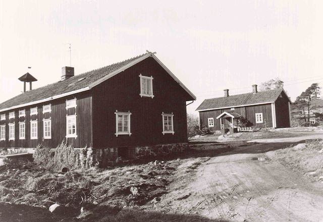 Den gamla Västergårds byggnad i bakgrunden före flyttningen. Personerna okända. Denna bild tillhör fam. Ramstedt.