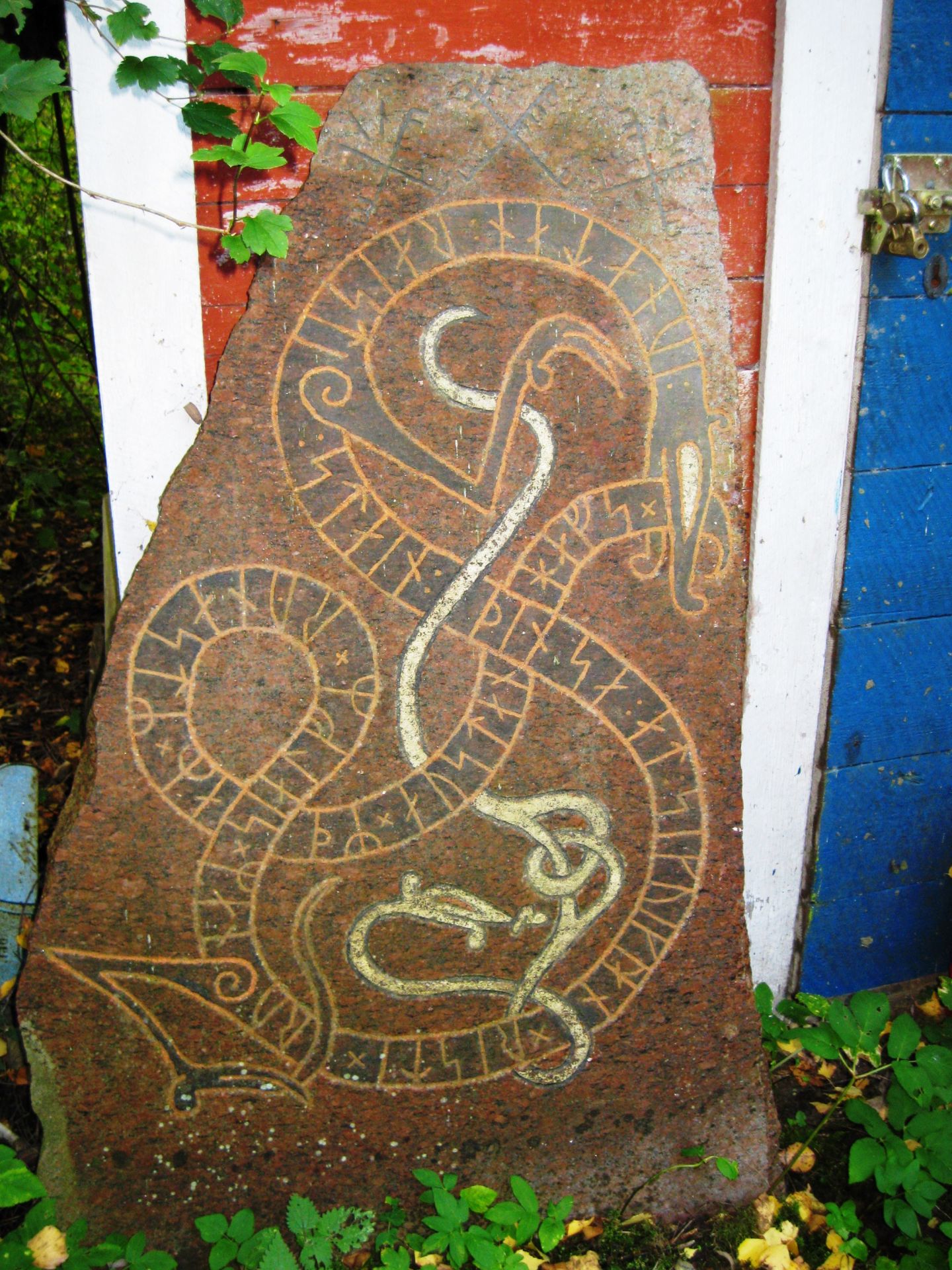 Jonatan reste denna sten åt sig levande. Ristade runor själv, den runkunnigaste mannen öster om havet.