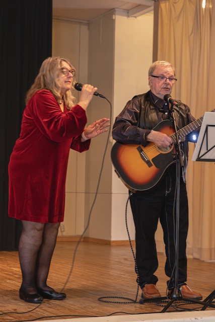 Allsången ledd av Jörgen Hollsten och med Kurre Långbacka vid pianot lockade fram ”Båklandets vackra Maja” och ”Två solröda segel”. Den senare i en annorlunda tappning då Kurre tog fram sitt munspel och visade att han behärskar även det instrumentet.