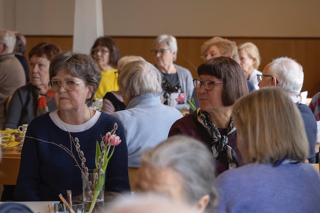 Det var programgrupp 3 som förtjänstfullt hade dekorerat Påsk på borden och på alla upptänkliga hörn och lister. Tuppen hade värpt chokladägg längs borden och stämningen steg ju flera som fyllde salen. På den vita duken snurrade ett bildspel från senaste års mars-träff och man kände igen lika ungdomliga ansikten som nu i borden runt omkring.