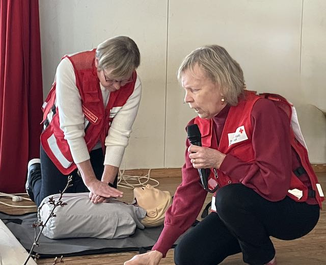 Vi lärde oss hur en hjärtstartare skall användas, en nog så viktig kunskap. Röda korsets Nina Alopaeustillsammans med Viveca Pyy lotsade oss igen proceduren och påminde först alla om 112 - appen som är enkel att använda vid nödsituationer. Ladda ner appen till din telefon så att du har den tillgänglig i nödsituationer. Ring alltså 112, sätt på högtalaren i telefonen och du får hjälp råd och hjälp.
