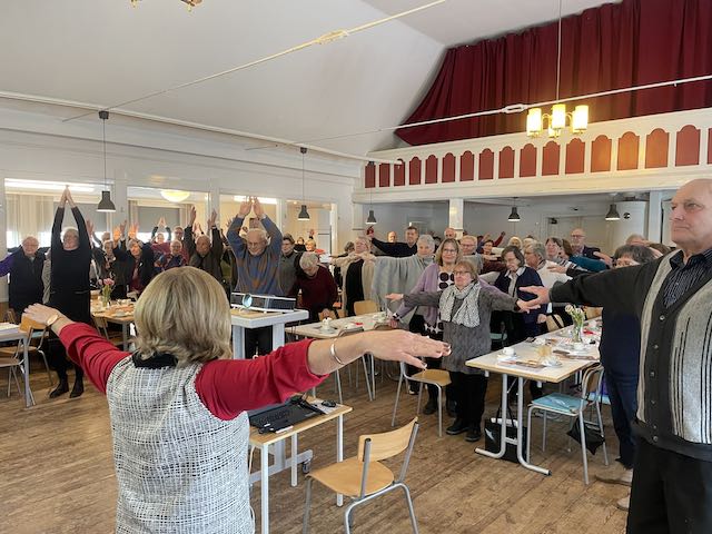 Stina Engblom Colliander knackar i mikrofonen och kallar den månghövdade stimmande församlingen till lystring. Det är pensionärsföreningens första höstträffen i Brankis. Många av föreningens smågrupper har redan startat sin verksamhet men 19.9 hålls första månadsträffen.